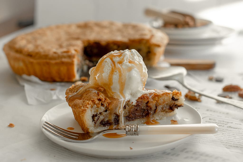 12. Serviere den Chocolate Chip Pie warm oder bei Raumtemperatur.