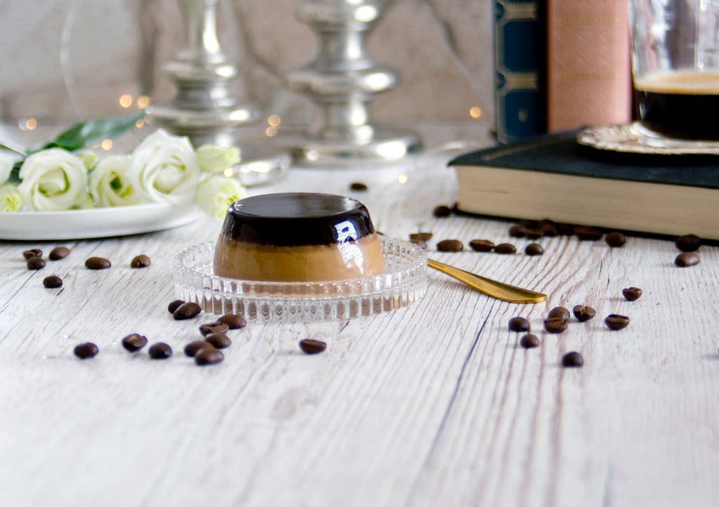 Dieses Mal habe ich mich für eine Variation mit Kaffee entschieden. Dazu habe ich einfach ein paar Löffel Instant-Kaffee in das Basisrezept der Panna Cotta eingerührt. Als besonderes Highlight gibt es obendrauf ein Gelee aus frischem Espresso.