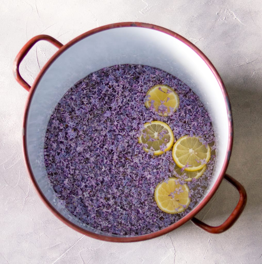 Die gewaschenen Blüten gemeinsam mit den Bio-Zitronen und der Zitronensäure in den Topf geben und nochmals kurz aufkochen lassen.